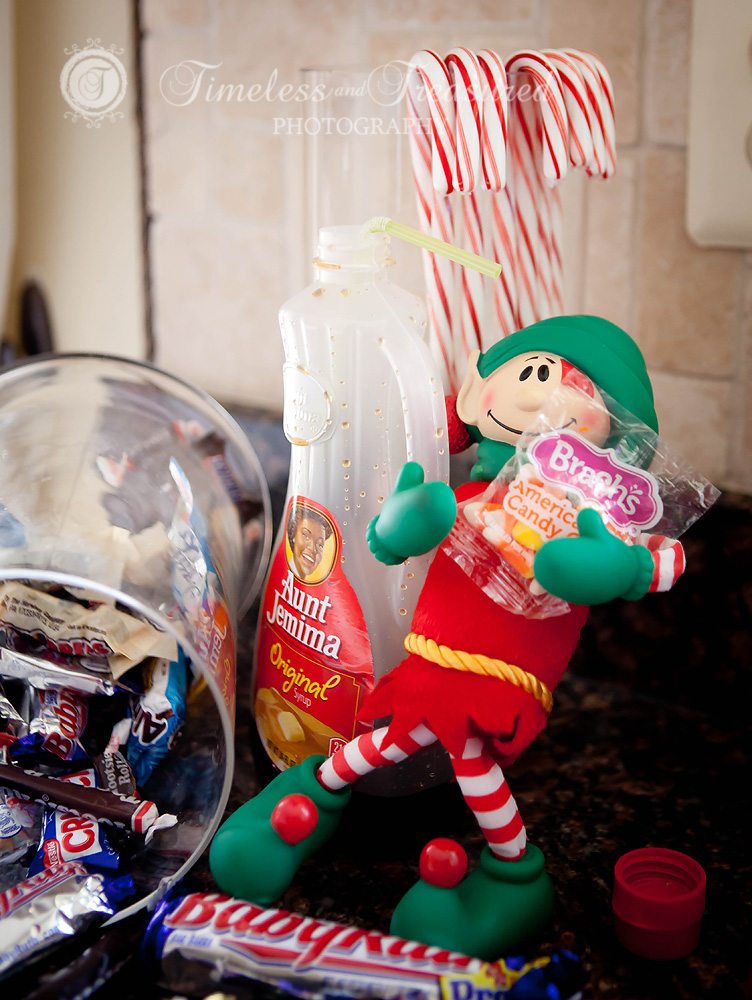 “candy, candy canes, candy corn, and syrup”. He drank all of our syrup, we thought we heard a slurping straw sound in the night.